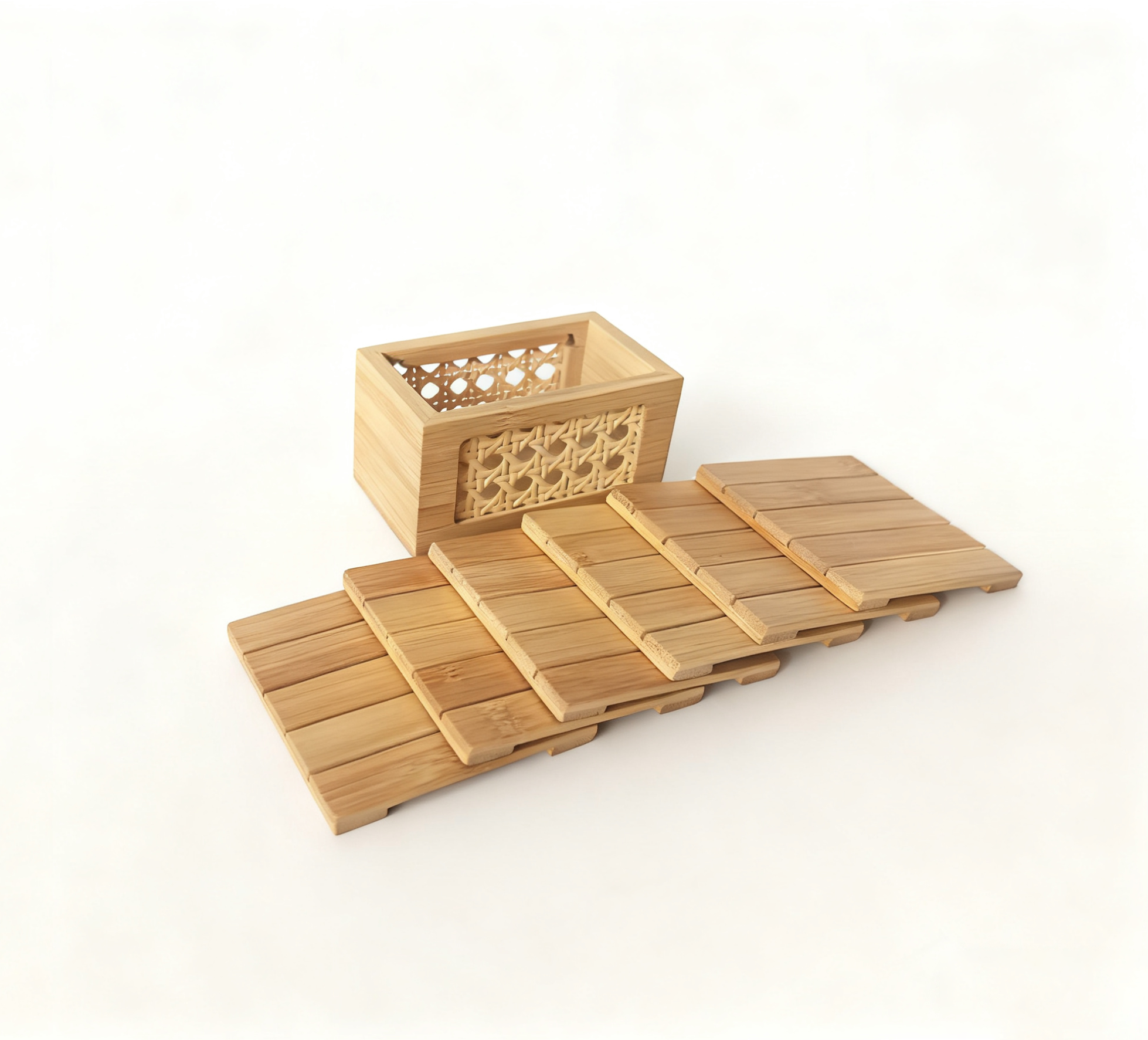 • ELEGANT DESIGN: Beautiful bamboo holder with intricate lattice pattern houses 6 matching coasters, perfect for enhancing your home decor while protecting surfaces