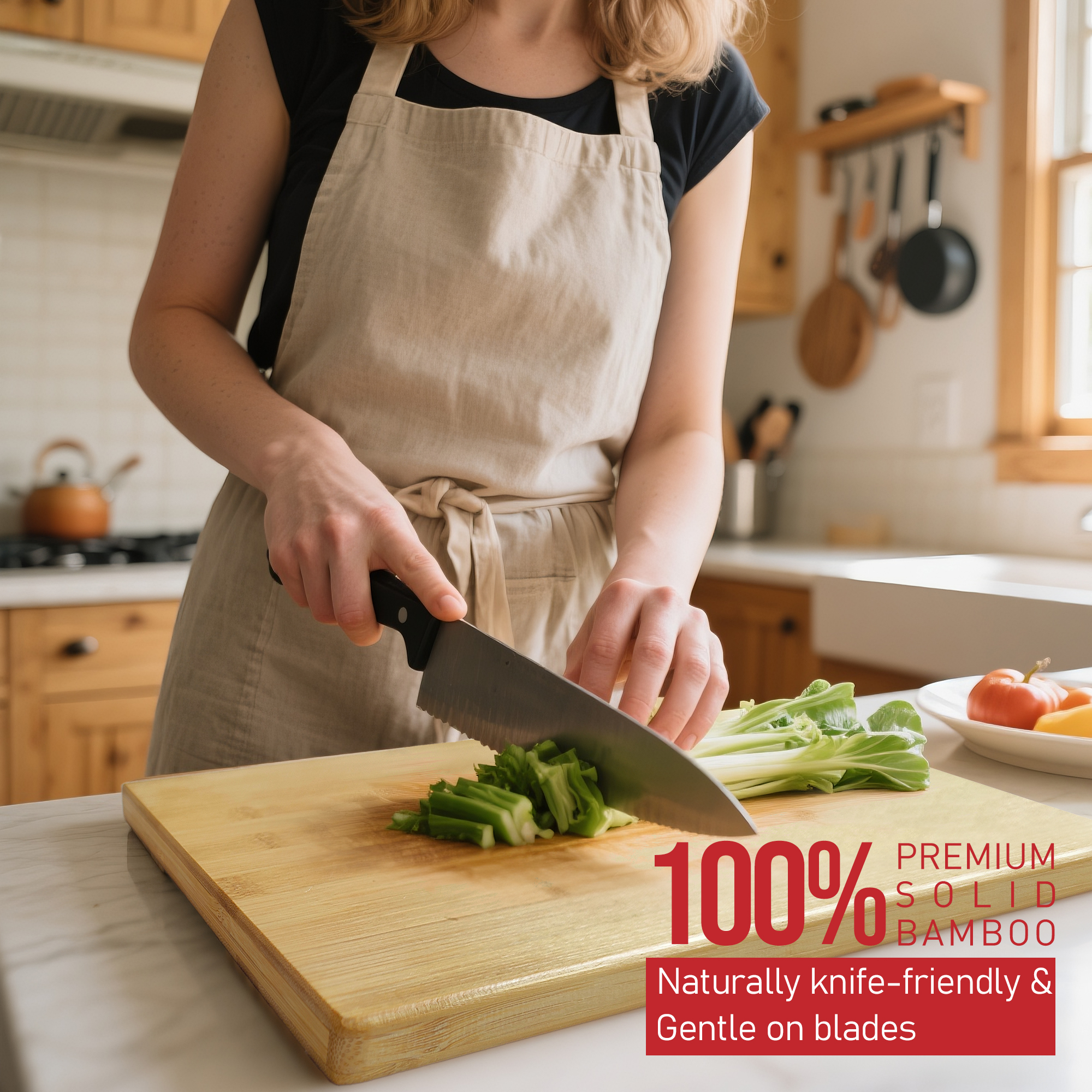 • ✅PURE MOSO BAMBOO – PRE-OILED & KNIFE-FRIENDLY – Made from premium, pre-oiled Organic Moso bamboo, this durable set is built to last. The surface is tough enough to resist deep knife marks yet gentle on blades, making it ideal for everything from chopping vegetables to carving roasts.