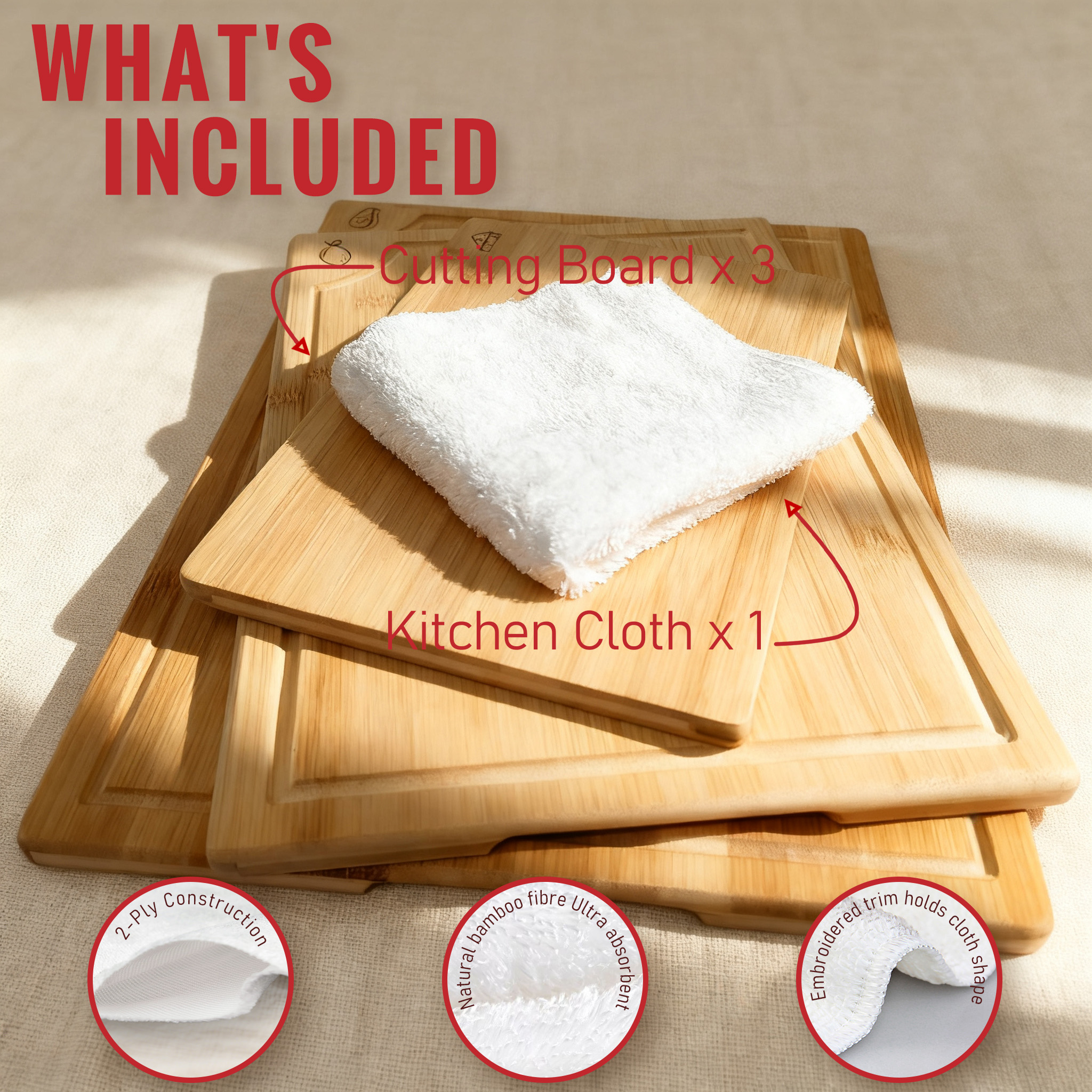 Premium Moso Bamboo 3-Piece Cutting Board Set — Kitchen Chopping Boards with Juice Grooves and Food Icons,Premium Bamboo Cutting Boards for Meat, Vegetables and Cheese with Handles